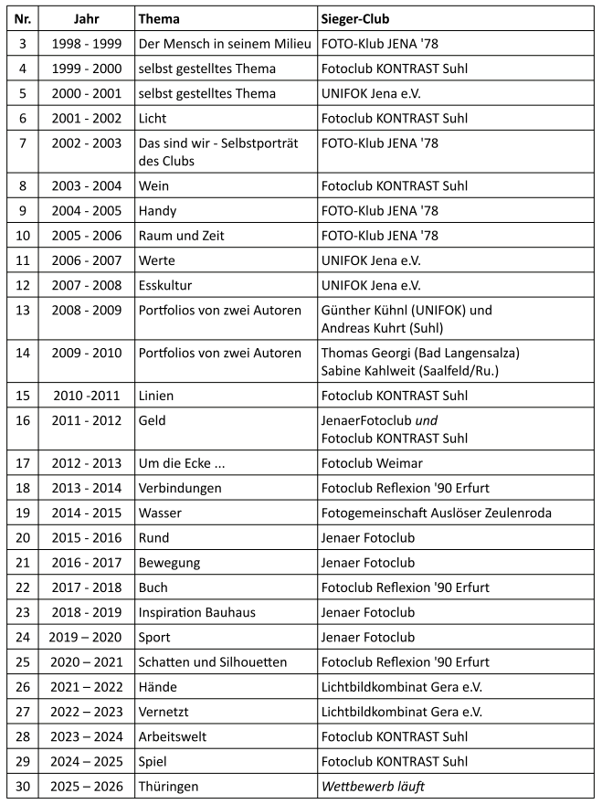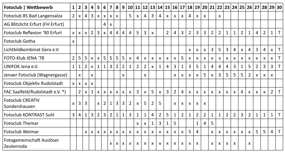 In der Regel findet in diesem Rahmen auch die Auswertung des vorhergehenden Jahrgangs des Mappenwettbewerbs Thüringer Fotoclubs statt.